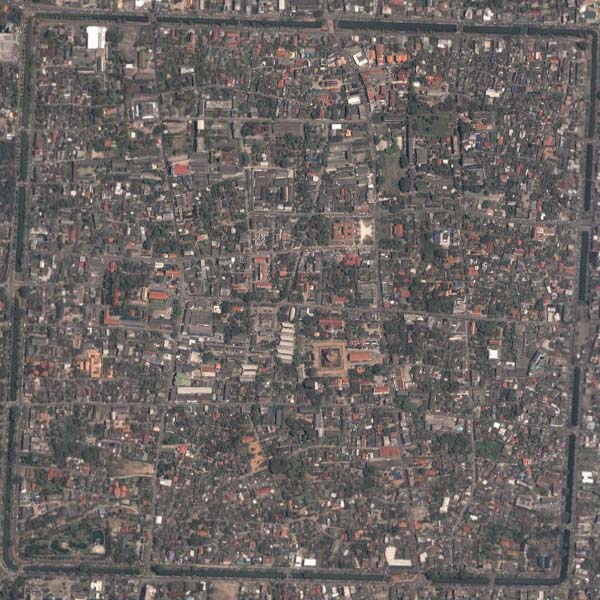 北辺の中央に「チャンプアック門」、西辺の中央に「スアンドーク門」、東辺の中央に「ターペー門」。