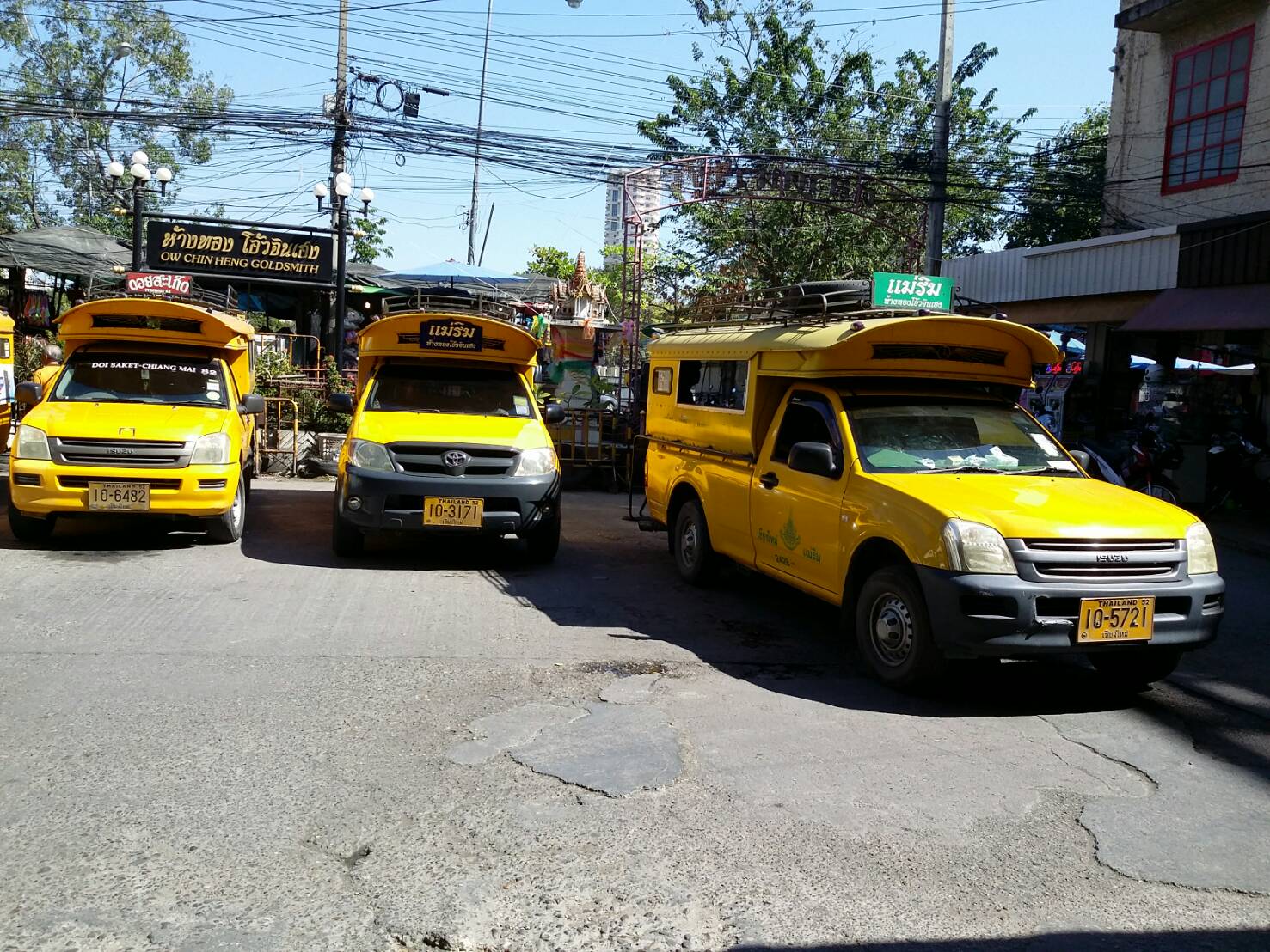 サンサイ方面へ行く緑のソンテウ、ドイ・サケット方面へ行く黄色いソンテウ、